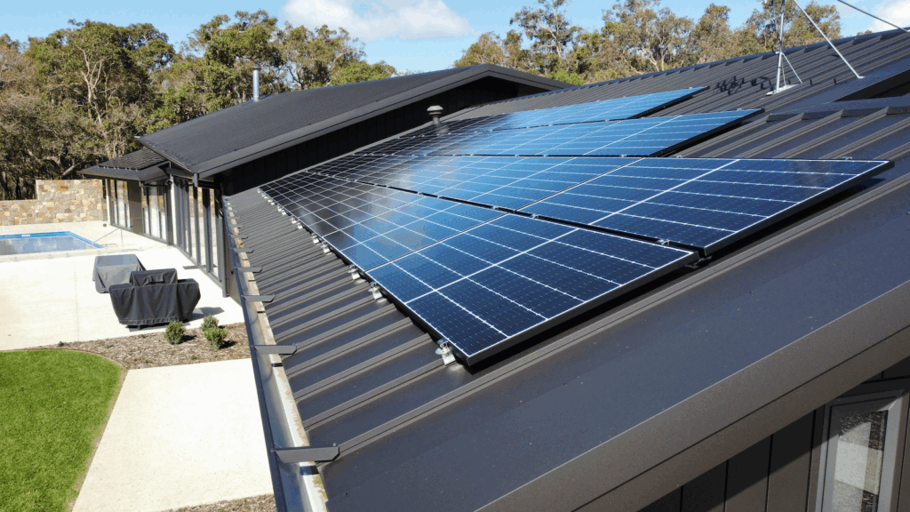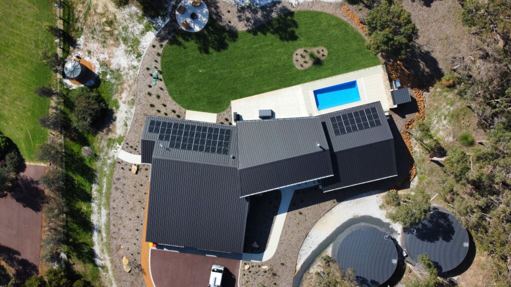 Aligned with this commitment to sustainability, a new rural build in Dunsborough features a Metroll Mac Distinction concealed-fix metal roof, equipped with a 37-panel, 15 kW solar array. The system uses the innovative PVKIT® rail-less mounting solution, combining energy with modern design.